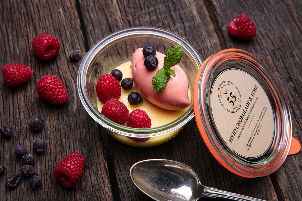 Retterne holder sig længe i køleskabet. Henkogningen gør, at retterne kan holde sig længe, uden brug af konserveringsmidler og andre numre. Vi oplever at retterne, ofte er gode efter bedst før datoen. Vi garanterer altid 30 dages holdbarhed ved levering. Så er der nem og hurtig dessert med hvid chokolade.