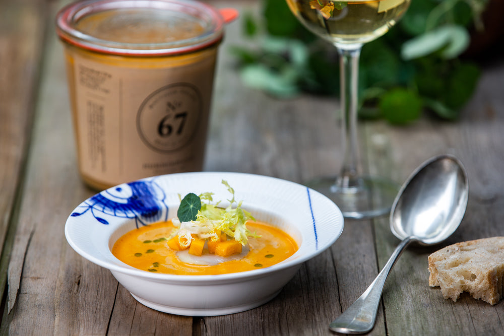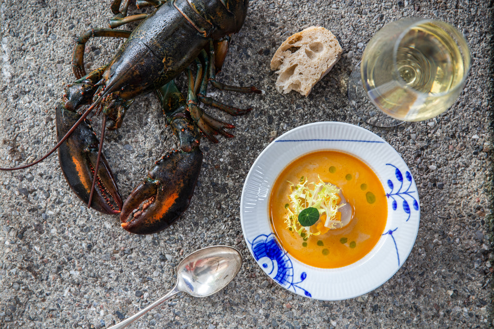 Vi har valgt at lave vores hummersuppe på hummer hoveder, Jomfruhummer og grøntsager. Ved at bruge kun det mest smagfulde fra hummeren, får vi en utrolig intens og fyldig smag. Til slut tilsætter vi god økologisk fløde og smager til med citron.