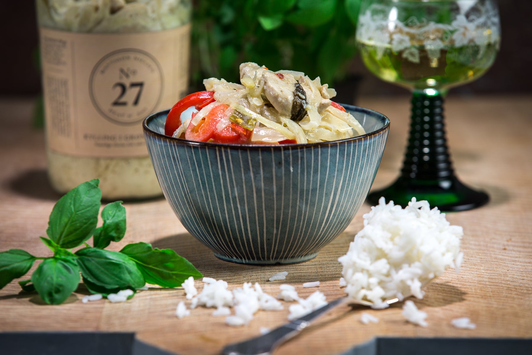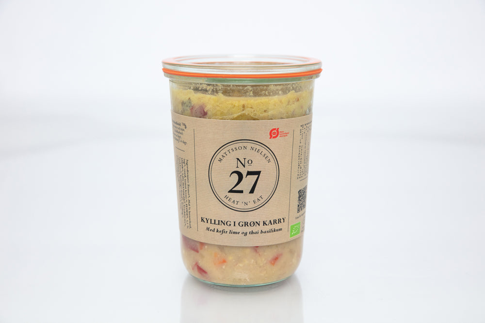 Vores ”Kylling i grøn karry” er lavet med unghane fra Gråsten Fjerkræ. Varm og aromatisk med kefir lime, sød basilikum og reduceret kokosmælk.