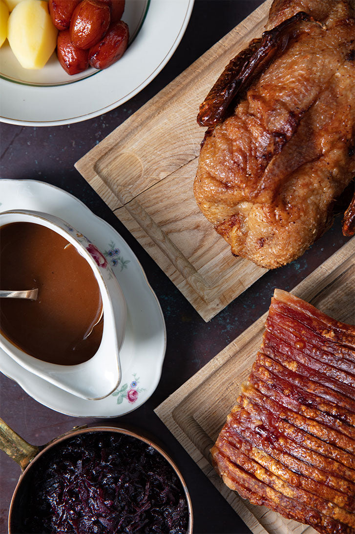 Spises sammen med and, flæskesteg, brune kartofler, kogte kartofler, rødkål og franske kartofler.